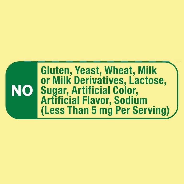 No gluten, yeast, wheat, milk or milk derivatives, lactose, sugar, artificial color, or artificial flavor